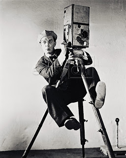 Photo of silent-movie actor Buster Keaton dressed as “the cameraman”. He is dressed n a shabby suit, bow tie and cap and is clinging to the tripod of his camera, legs off the ground looking stone faced into the distance.